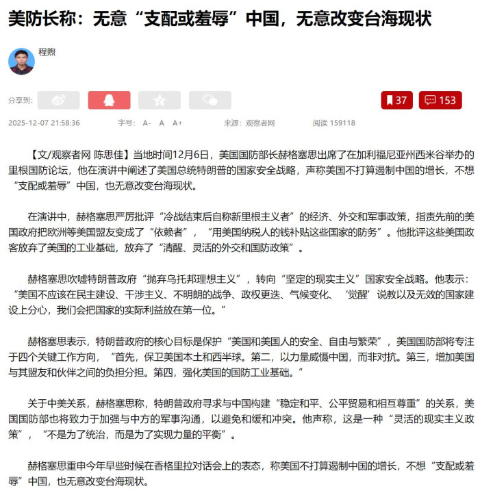 日前,美防长赫格塞思全方位阐释美国的新版国家安全战略,在谈到中国时,他进一步进行降调,缓和了语气,直言美国不寻求遏制中国发展,无心“支配或羞辱”中国,更加无意改变台海现状。五角大楼将致力于加强与解放军沟通,避免两军误判引发冲突,美军不寻求在印太地区占据统治地位,而是要实现力量平衡。